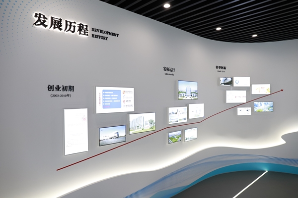 正中區(qū)域采用了通電玻璃、三維攝影、分屏展示等現(xiàn)代科技手段,與流線型“芯時(shí)代”光帶相呼應(yīng),充分彰顯了集團(tuán)科技化應(yīng)用。在“發(fā)展歷程回眸”功能區(qū),展示了集團(tuán)“創(chuàng)業(yè)初期”“ 實(shí)體運(yùn)行”“ 轉(zhuǎn)型創(chuàng)新”三個(gè)不同階段的發(fā)展亮點(diǎn)。
