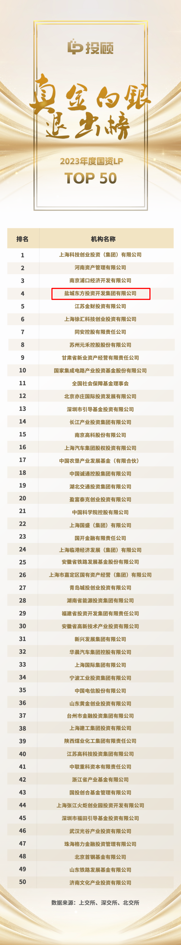 鹽城東方集團位列“2023年度國資LP TOP50”第4位,比2022年上升13位次,成為鹽城唯一一家連續三年入圍該榜單的國企;位列“2023年度LP總榜TOP50”第7位,比2022年上升19位次,成為連續兩年上榜、鹽城首家躋身該榜單的企業。