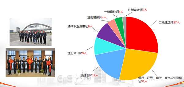 突破地處蘇北的區(qū)位劣勢,瞄準(zhǔn)“985、211”相關(guān)知名高校,以美好的發(fā)展前景吸引重慶大學(xué)、武漢大學(xué)、蘭州大學(xué)等名校16位人才加盟;立足專業(yè)對口、實(shí)用通用原則,公開選聘東南大學(xué)、對外經(jīng)貿(mào)大學(xué)、河海大學(xué)、蘇州大學(xué)等知名高校的工程建設(shè)、招商引資、市場分析、對外投資、財(cái)務(wù)管理、風(fēng)險(xiǎn)防控等方面29位高技能人才。目前,集團(tuán)擁有注冊會(huì)計(jì)師9名、注冊稅務(wù)師4人、注冊審計(jì)師2人,一級造價(jià)師4人、一級建造師19人、二級建造師27人,擁有銀行、證券、期貨、基金等從業(yè)資格證31人,持有法律職業(yè)資格證9人。