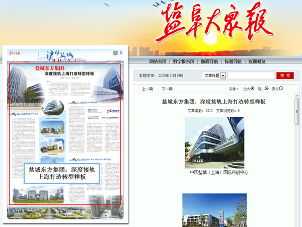11月19日,《鹽阜大眾報》第3版“滬動鹽城”欄目,以《鹽城東方集團:深度接軌上海 打造轉型樣板》整版聚焦鹽城東方集團積極踐行“兩海兩綠”、融入“滬動鹽城”戰略,謀求高質量發展的生動實踐。同日,“登瀛觀察”公眾號轉發推介。