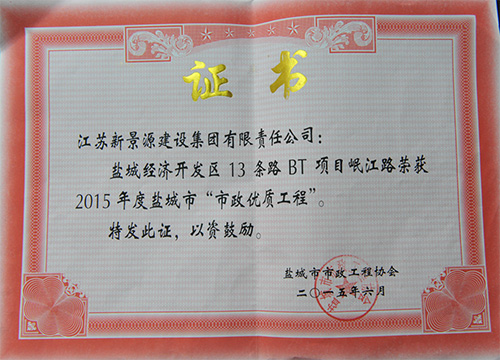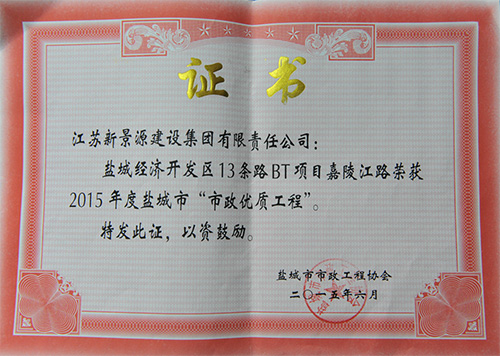 東方市政公司承建的鹽城經(jīng)濟(jì)技術(shù)開發(fā)區(qū)13條路BT項(xiàng)目嘉陵江路、岷江路榮獲2015年度鹽城市“市政優(yōu)質(zhì)工程”