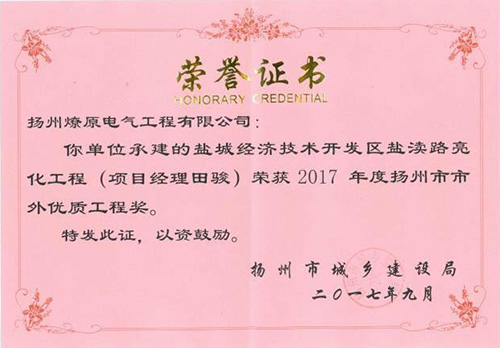 東方市政公司承建的鹽城經(jīng)濟(jì)技術(shù)開發(fā)區(qū)鹽瀆路亮化工程榮獲2017年度揚(yáng)州市市外優(yōu)質(zhì)工程獎(jiǎng)