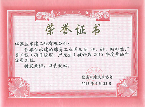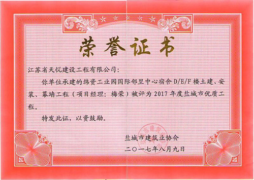 東方置業(yè)公司承建的韓資工業(yè)園鄰里中心宿舍D/E/F樓土建、安裝、幕墻工程榮獲2017年度鹽城市優(yōu)質(zhì)工程獎(jiǎng)