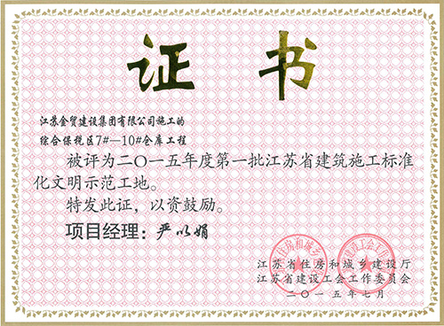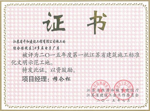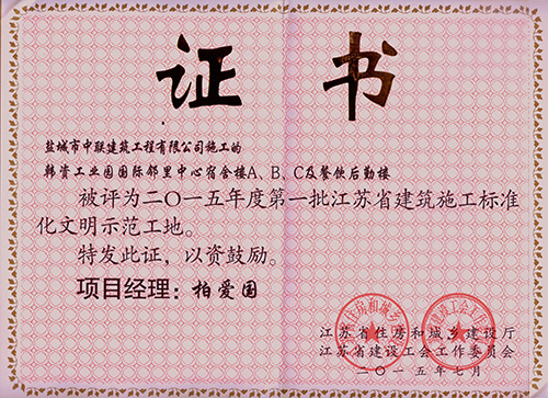 悅欣花園住宅樓(含人防)土建、安裝工程和北師大鹽城附校幼兒園、小學(xué)部榮獲三星級(jí)施工標(biāo)準(zhǔn)化工地,北師大鹽城附校(初中、高中部)、東方之洲B9、B10土建工程、鹽城綜保區(qū)二期封關(guān)新建倉庫和新建標(biāo)廠、韓資工業(yè)園五期標(biāo)廠榮獲一星級(jí)施工標(biāo)準(zhǔn)化工地。