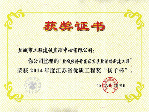 東方市政公司承建的鹽城經(jīng)濟(jì)技術(shù)開發(fā)區(qū)東區(qū)鹽瀆路新建工程榮獲2014年度江蘇省優(yōu)質(zhì)工程獎(jiǎng)“揚(yáng)子杯”