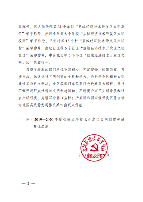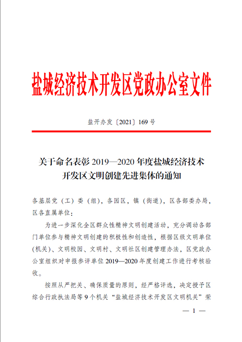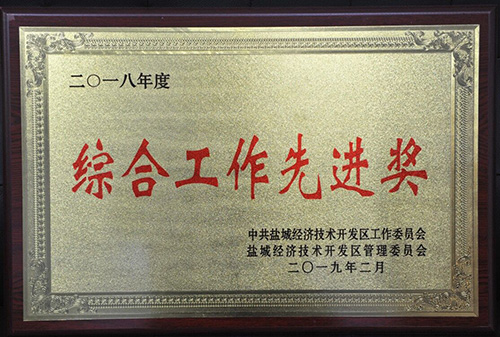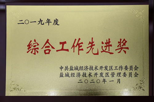 榮獲2019年度鹽城經(jīng)濟(jì)技術(shù)開發(fā)區(qū)綜合工作先進(jìn)獎(jiǎng)。