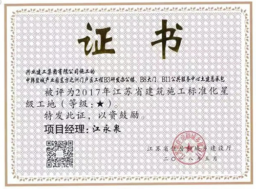 中韓鹽城產(chǎn)業(yè)園東方之洲門戶區(qū)B3研發(fā)辦公樓、B8大門、B11公共服務(wù)中心土建總承包工程榮獲“2017年度江蘇省建筑施工標(biāo)準(zhǔn)化星級(jí)工地”。