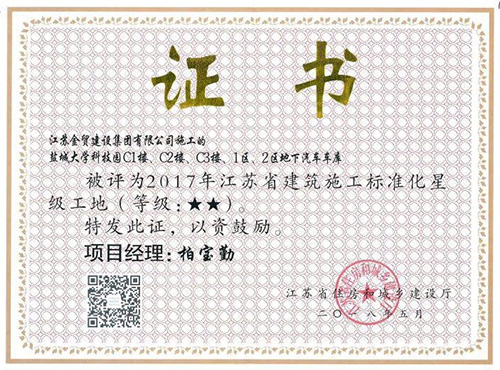 鹽城大學(xué)科技園(未來科技城)C1樓、C2樓、C3樓、1區(qū)、2區(qū)地下車庫項(xiàng)目榮獲“2017年度江蘇省建筑施工標(biāo)準(zhǔn)化星級(jí)工地”。