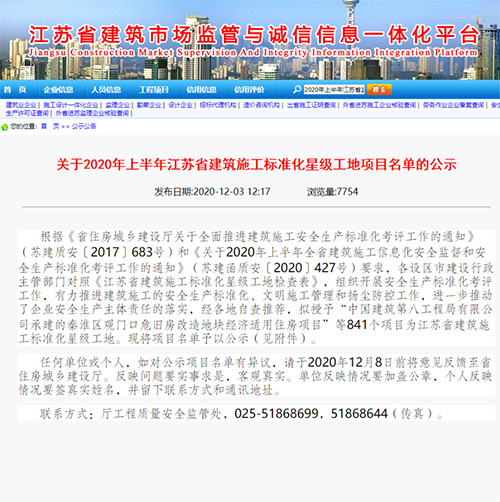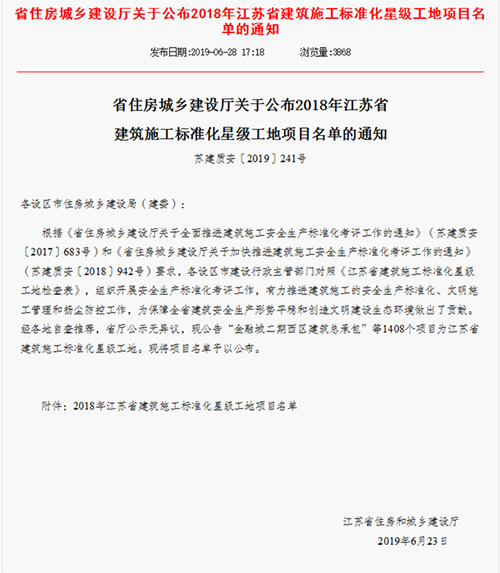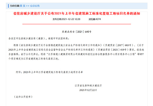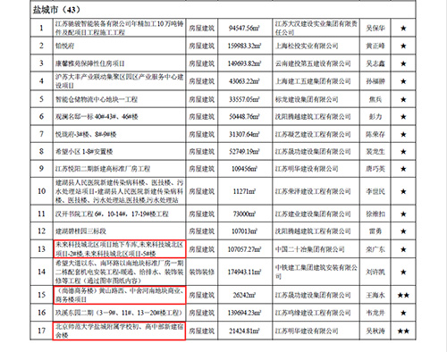 鹽城東尚德商務(wù)樓榮獲2021年度“江蘇省二星級(jí)施工標(biāo)準(zhǔn)化工地”;未來科技城北區(qū)、北師大鹽城附校(初、高中部)新建宿舍樓榮獲2021年度“江蘇省一星級(jí)施工標(biāo)準(zhǔn)化工地”。
