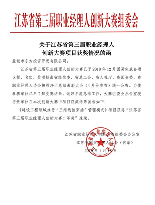 鹽城東方集團(tuán)北師大鹽城附校項(xiàng)目組《建設(shè)工程領(lǐng)域推行“三維線性穿插”管理模式》獲得“江蘇省第三屆職業(yè)經(jīng)理人創(chuàng)新大賽二等獎(jiǎng)”。