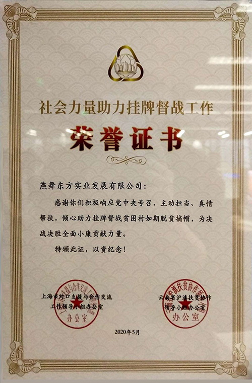 燕舞東方實(shí)業(yè)發(fā)展有限公司獲得社會(huì)力量助力掛牌督戰(zhàn)工作榮譽(yù)證書。