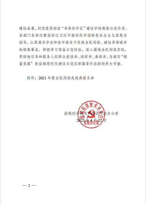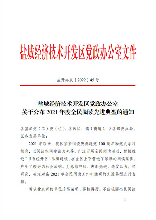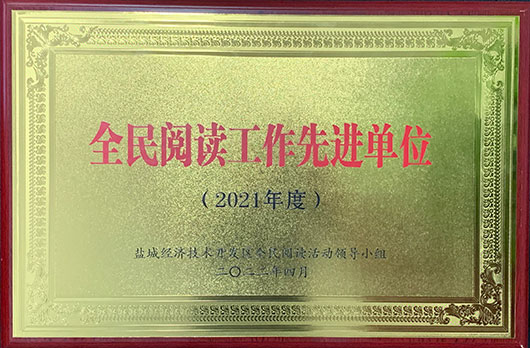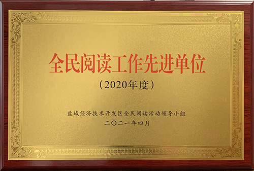 集團(tuán)榮獲鹽城經(jīng)開區(qū)全民閱讀活動(dòng)領(lǐng)導(dǎo)小組頒發(fā)的2020年度“全民閱讀工作先進(jìn)單位”獎(jiǎng)項(xiàng)。