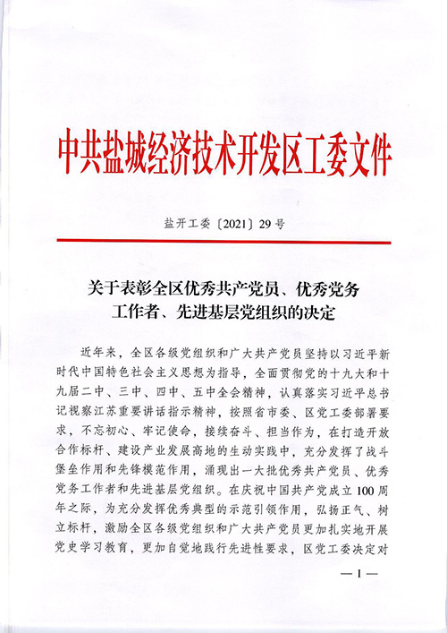 榮獲2018年度鹽城經(jīng)濟(jì)技術(shù)開發(fā)區(qū)“先進(jìn)基層黨組織”稱號(hào)