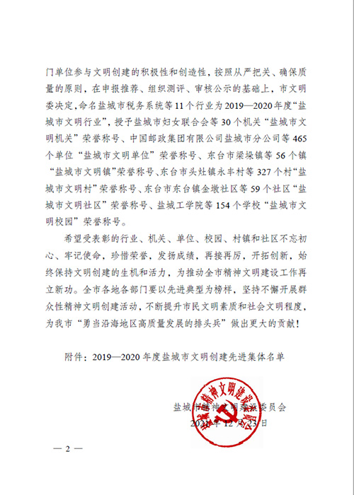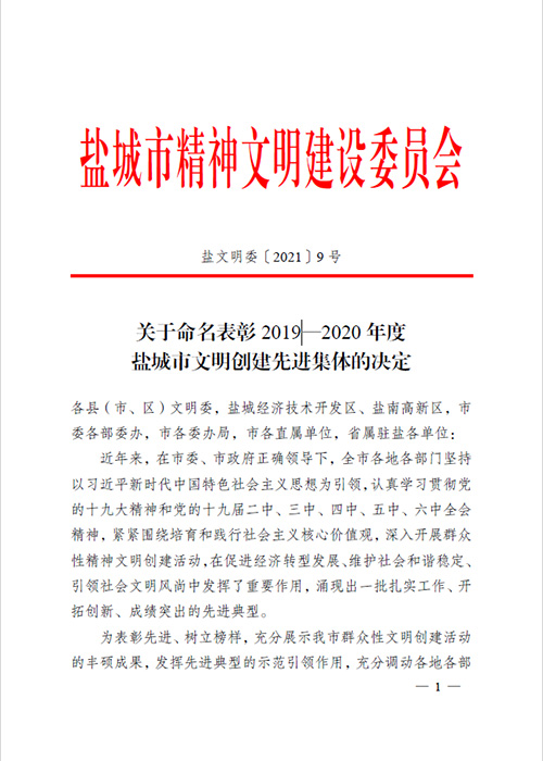 集團(tuán)榮獲中共鹽城市委、鹽城市人民政府頒發(fā)的“創(chuàng)建全國文明城市工作先進(jìn)單位”獎(jiǎng)項(xiàng)。
