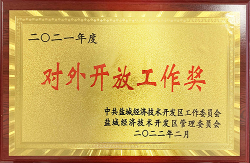 集團(tuán)榮獲2021年度鹽城經(jīng)濟(jì)技術(shù)開發(fā)區(qū)綜合工作先進(jìn)獎(jiǎng),同時(shí)獲得對(duì)外開放工作單項(xiàng)獎(jiǎng)。