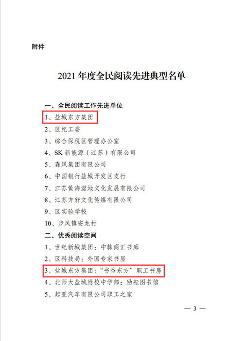 鹽城東方集團(tuán)榮獲2021年度區(qū)全民閱讀工作先進(jìn)單位;鹽城東方集團(tuán)”書香東方”職工書房榮獲區(qū)優(yōu)秀閱讀空間。