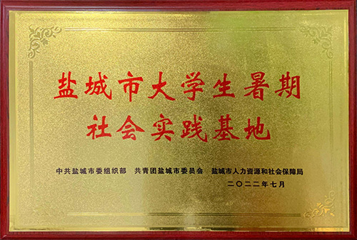 獲得中共鹽城市委組織部、共青團(tuán)鹽城市委員會(huì)、鹽城市人力資源和社會(huì)保障局聯(lián)合頒發(fā)的“鹽城市大學(xué)生暑期社會(huì)實(shí)踐基地”稱號(hào)。