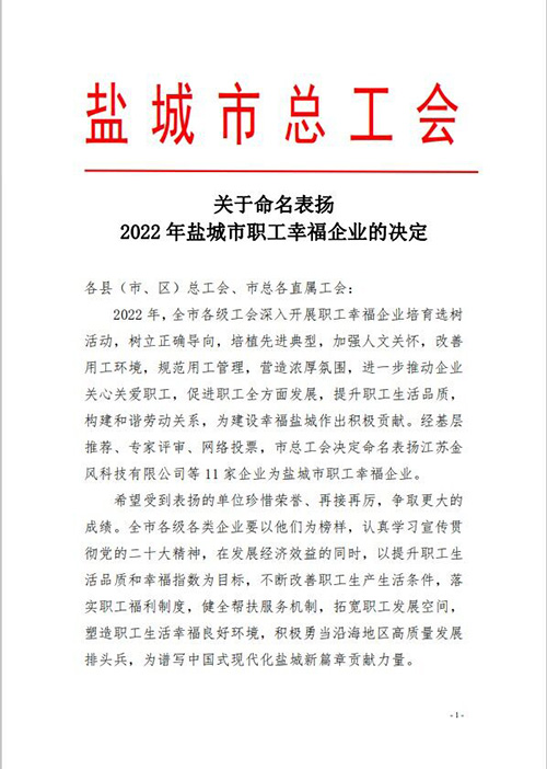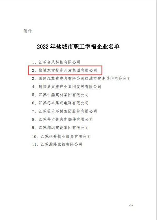 鹽城市總工會(huì)命名表揚(yáng)鹽城東方集團(tuán)為鹽城市職工幸福企業(yè)。
