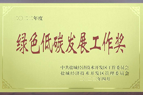 集團(tuán)榮獲鹽城經(jīng)濟(jì)技術(shù)開發(fā)區(qū)2022年度綜合工作先進(jìn)獎(jiǎng),同時(shí)獲得綠色低碳發(fā)展工作單項(xiàng)獎(jiǎng)。